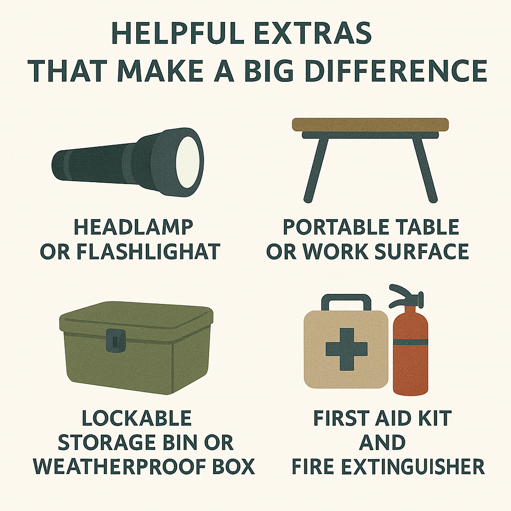 We recommend keeping your most-used tools in a storage tote, dedicated toolbox, or in your vehicle so you're always ready for a trip to the property. If you plan to stay longer, building a small shed or bringing a lockable trailer for secure storage can be a game-changer.