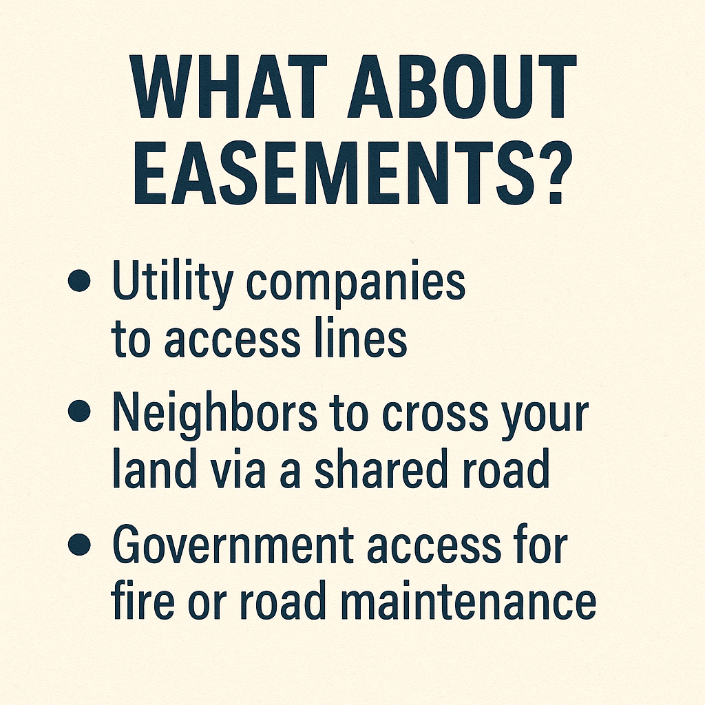 Easements are usually permanent and tied to the land title. Knowing where they are can help you plan structures, fencing, or driveways.