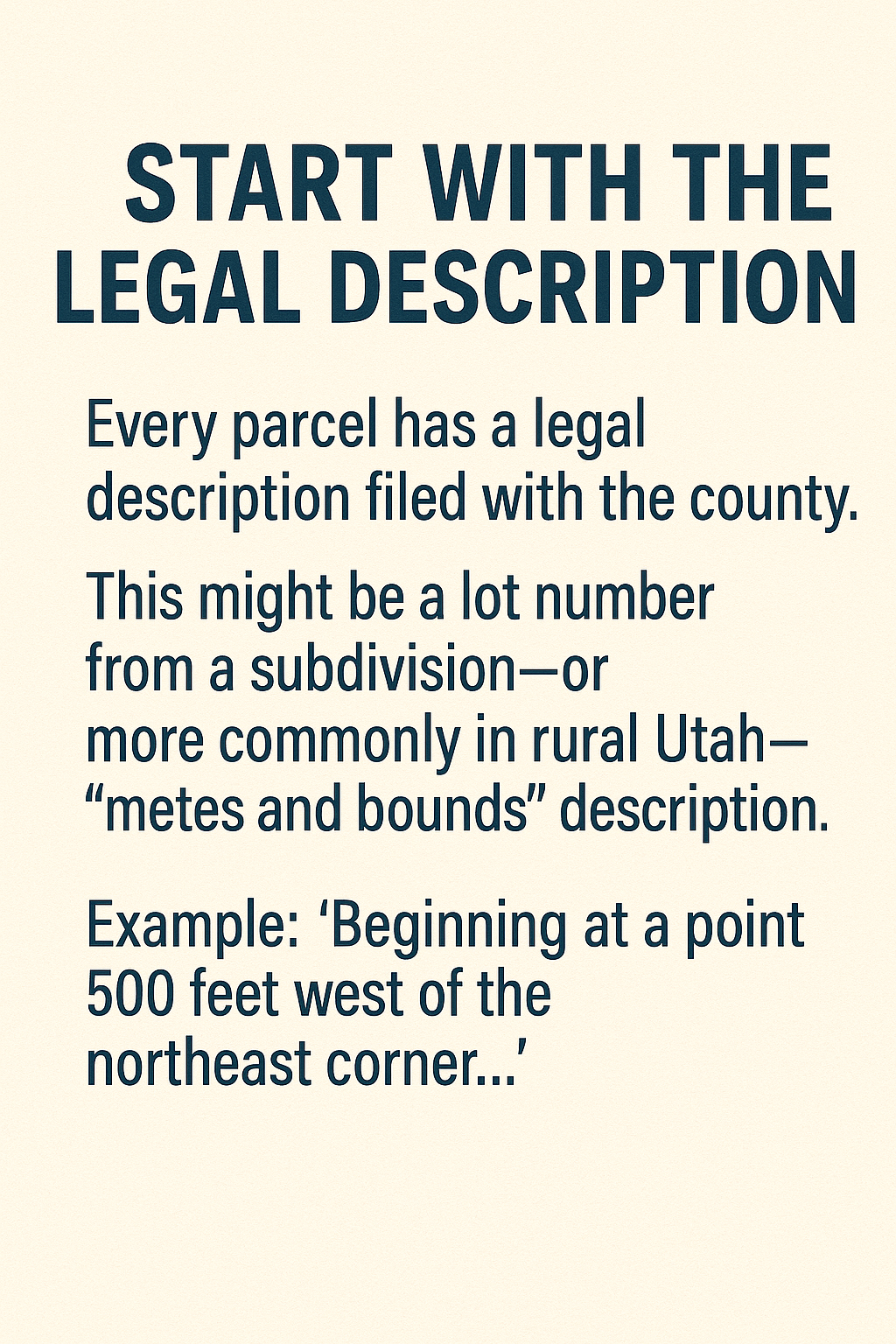 Every parcel has a legal description filed with the county. This might be a lot number from a subdivision—or more commonly in rural Utah—a “metes and bounds” description. This uses distance and compass directions to describe the property.