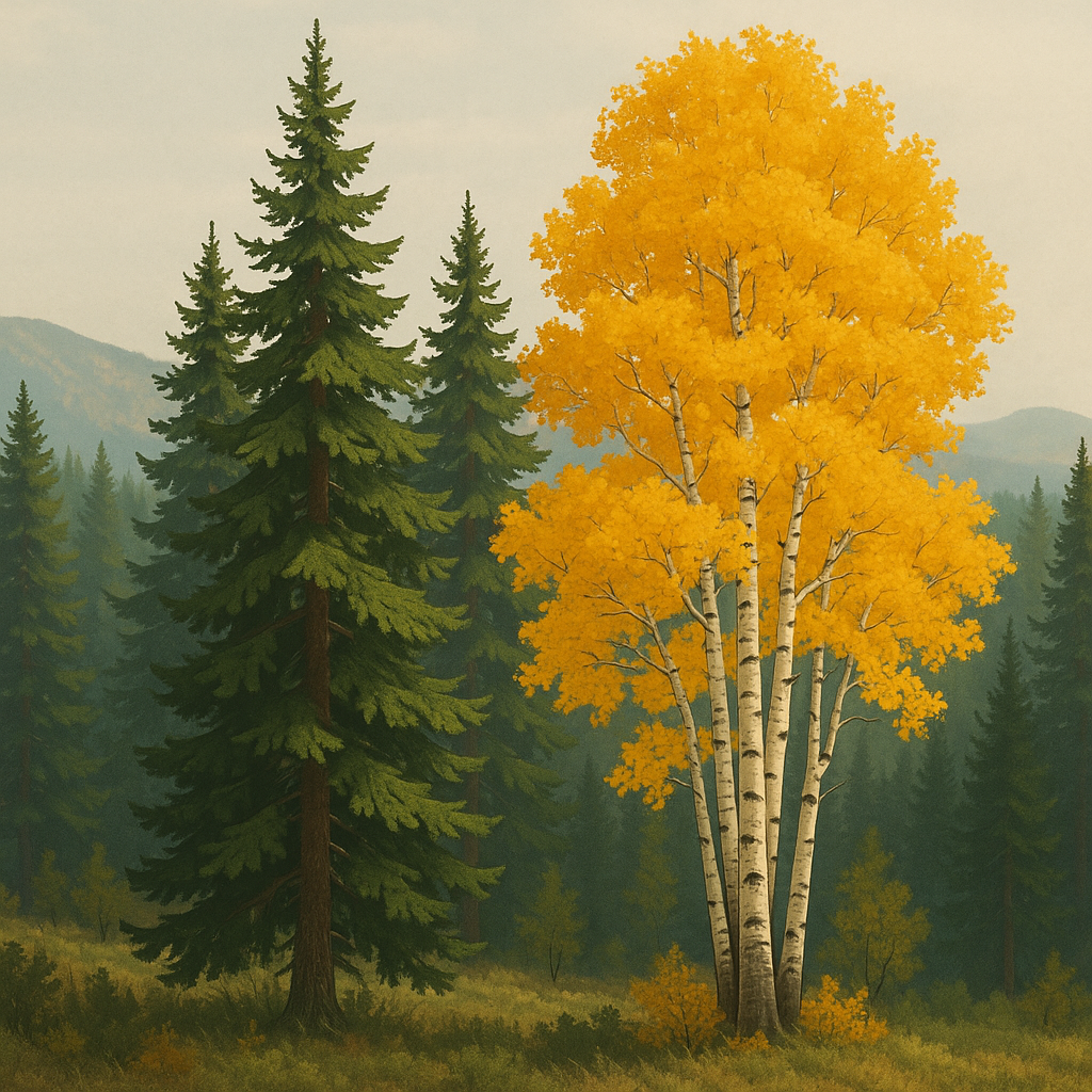 Pine and Quakie land means the property has a mix of evergreen pines and quaking aspens. Pine trees stay green year-round and can block wind and give shade. Quaking aspens change with the seasons, with green leaves in summer and yellow leaves in fall. Together, they create a natural setting and provide space for wildlife.