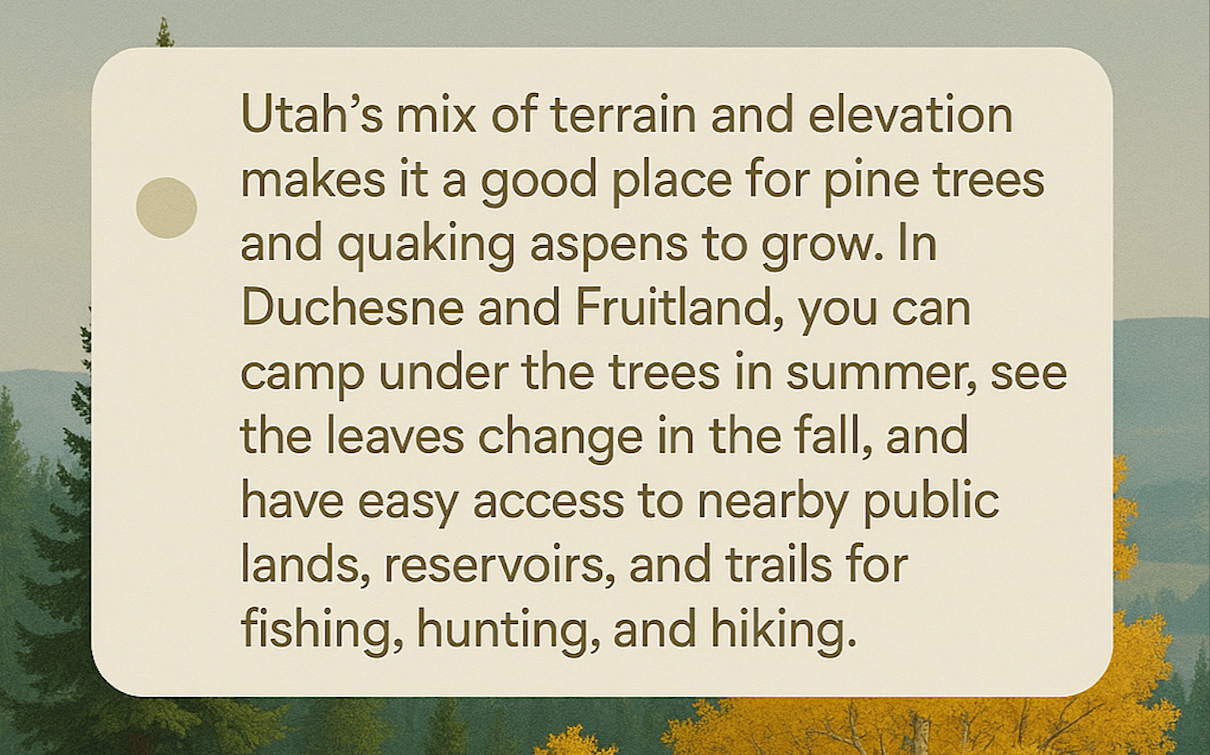 Pine and Quakie land is a type of property that includes both pine trees and quaking aspens. These trees grow well together in Utah’s mountain and foothill areas, especially around Duchesne and Fruitland. The land is often used for camping, hunting, fishing, or as a future site for a cabin. Many people buy it for the flexibility to enjoy it now and develop it later.