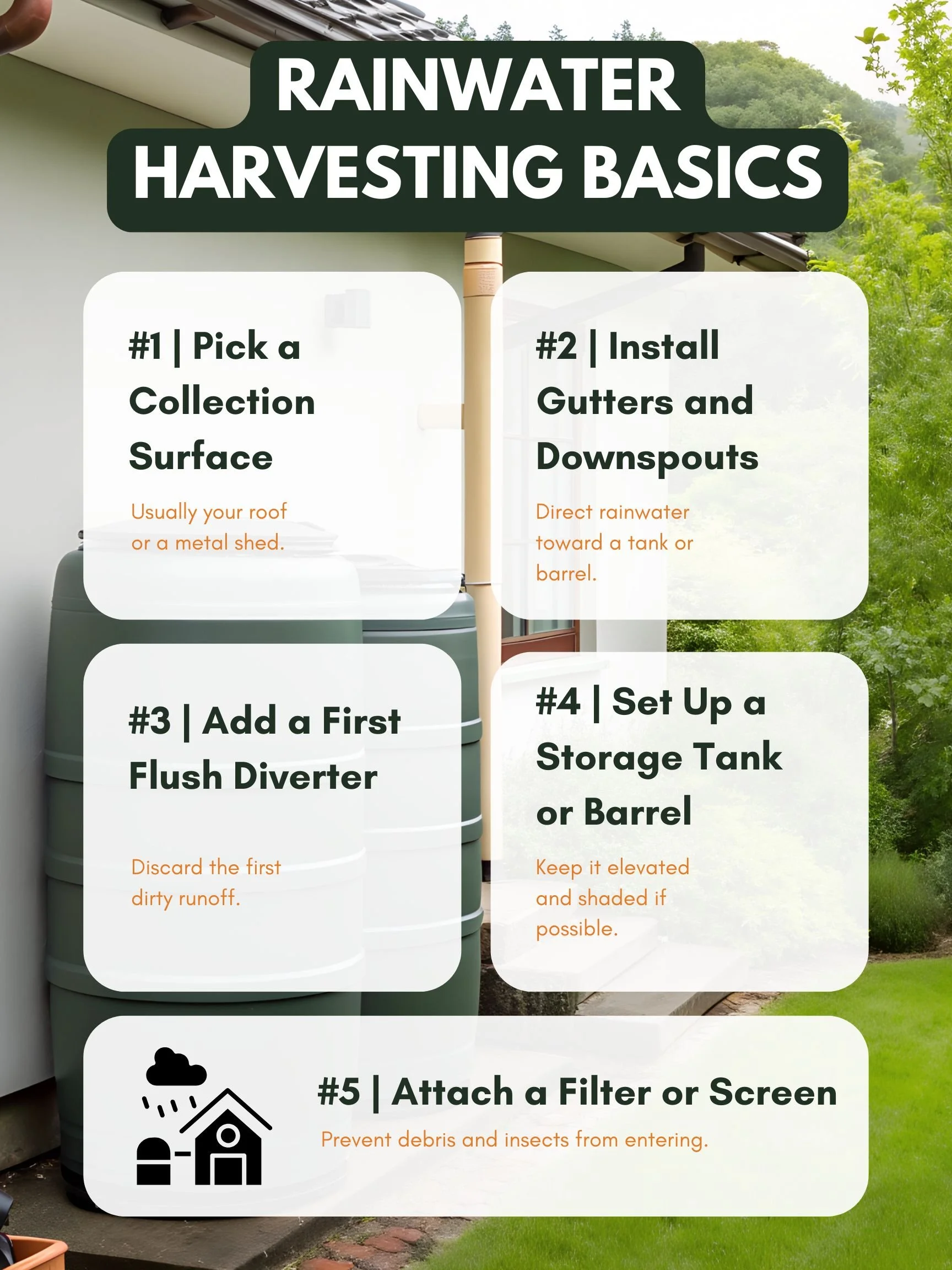 Storage capacity: Start with what you need, then expand as you learn your water habits. A few barrels may be enough for light garden use, while larger tanks are better for livestock or home supply.
