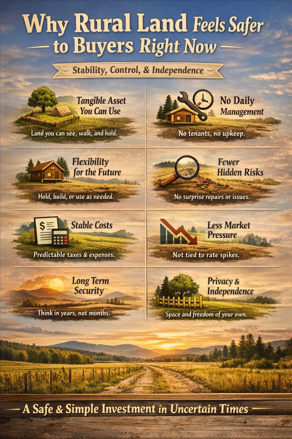 Rural land feels safer to buyers right now because it offers control, simplicity, and flexibility in an uncertain environment. It is tangible, understandable, and adaptable. Ownership does not depend on daily performance or outside systems continuing to function exactly as expected.